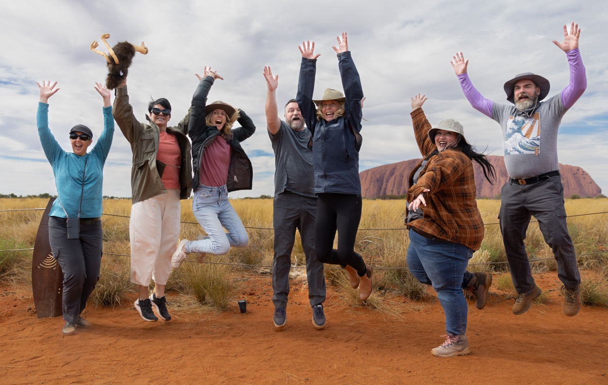 group of people jumping in front of Uluru