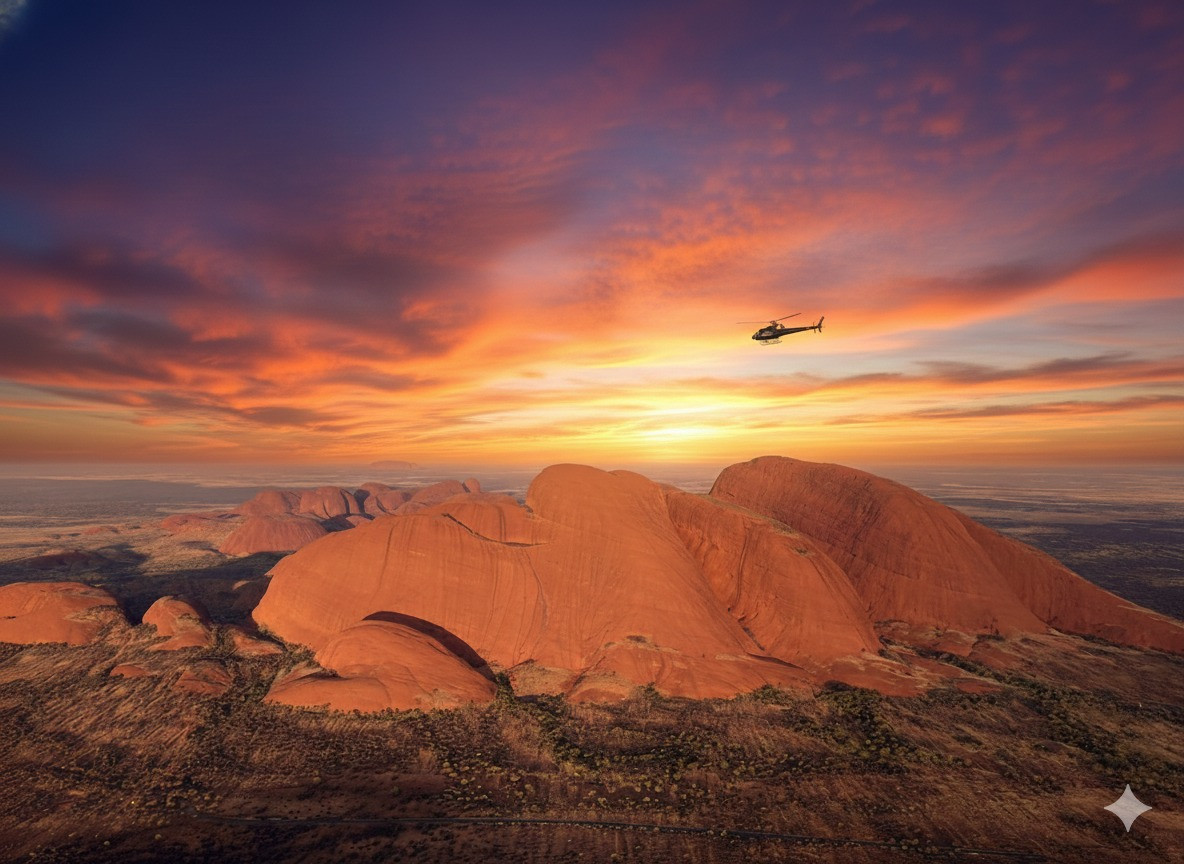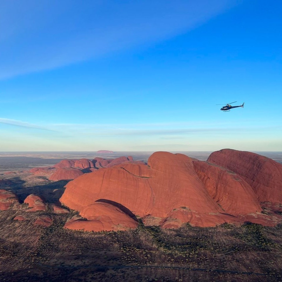 Helicopter hovering above Kata Tjuta at sunset in Central Australia.