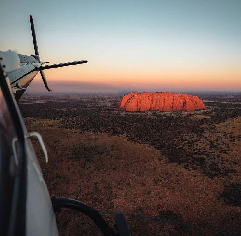 View of Uluru at sunset seen from inside a helicopter over Central Australian desert.